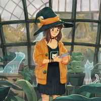 an indoor space with plants, giving off a vibe of a cozy or mystical environment. It's a colorful illustration that seems to blend elements of