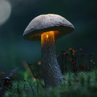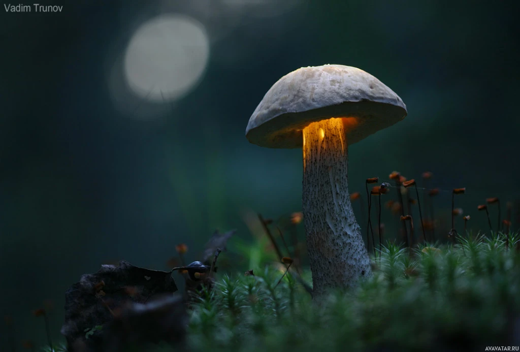 The image shows a mushroom in a forested area, likely at night or during twilight given