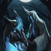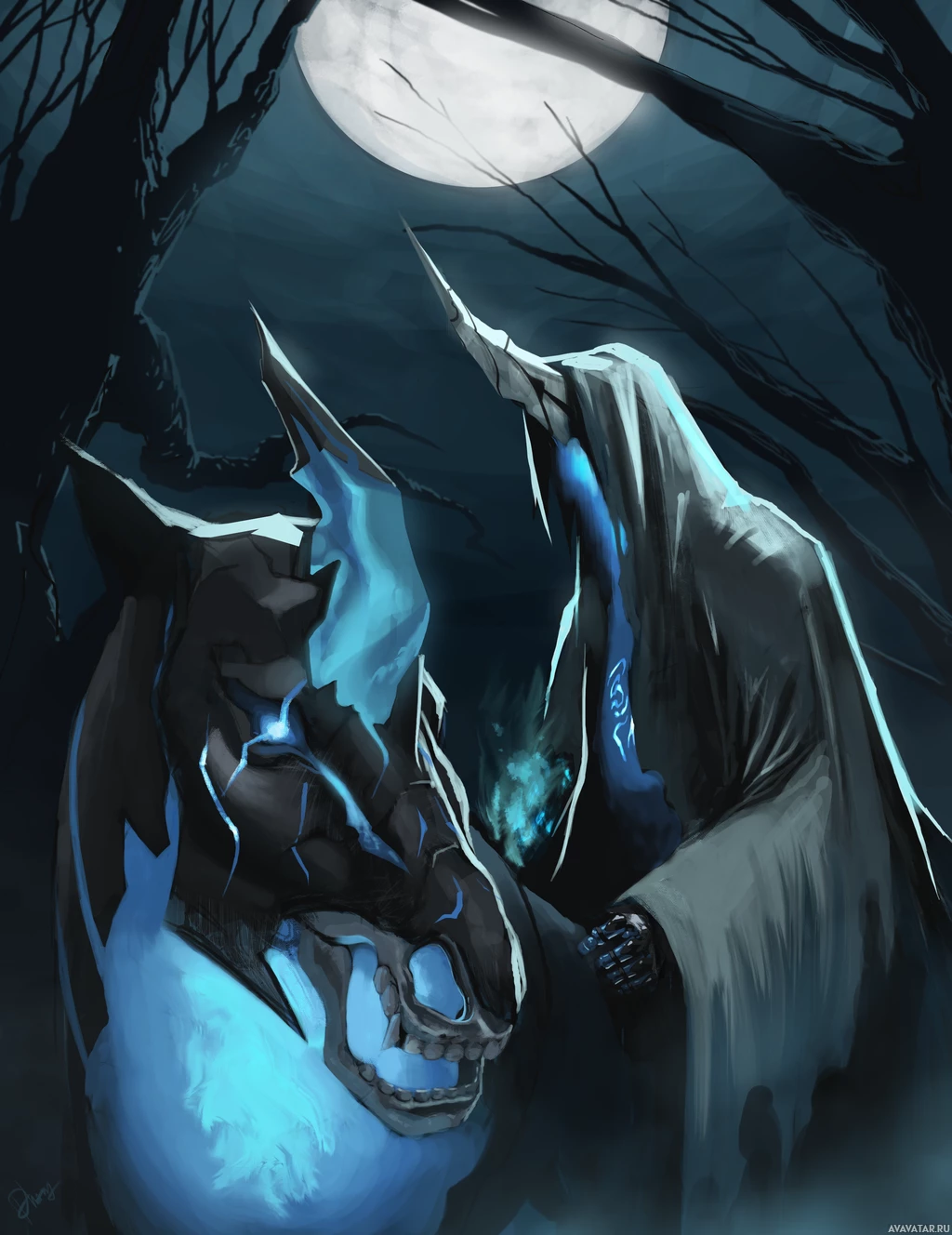 glowing eyes, holding the reins of the dragon knight, which has a fierce appearance with spikes and flames around its body. The setting appears to be at night under
