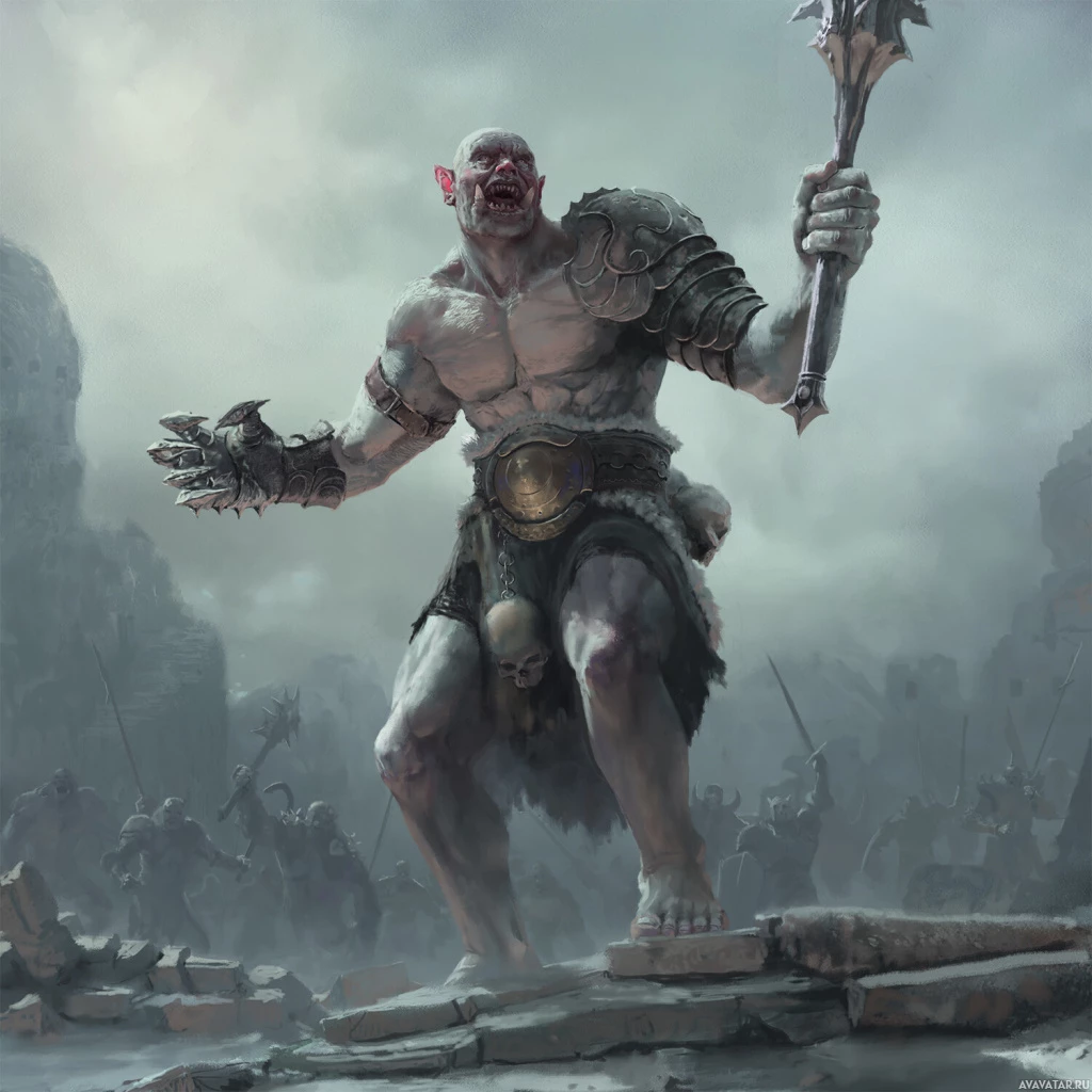 a muscular build and is wearing what appears to be armor, possibly of a tribal or primitive design. He is holding a large