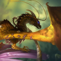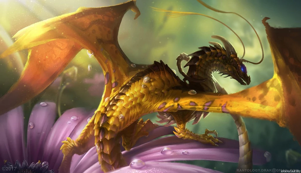 a fantasy setting. The dragon has a yellowish hue with darker accents and is depicted with wings, scales, and a tail, which are