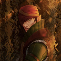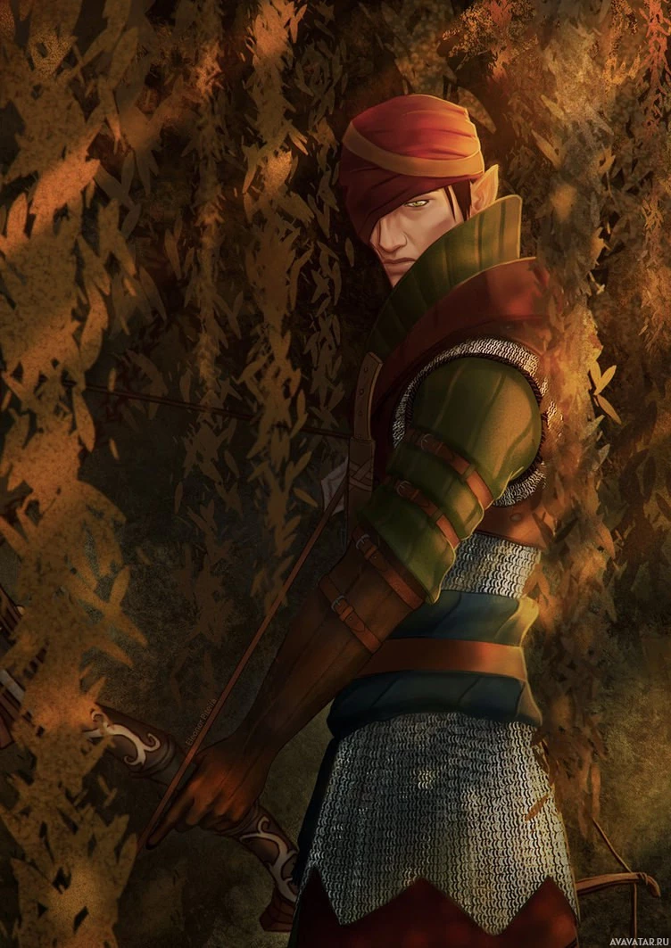pointed ears and an elongated face. They are dressed in armor that includes a helmet with a visor obscuring their eyes, which adds to their mysterious appearance. The setting seems to be autumnal, as suggested by