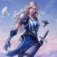 an illustrated character that appears to be a fantasy-themed elf. She is wearing armor and holding a sword, which suggests she may have a warrior or