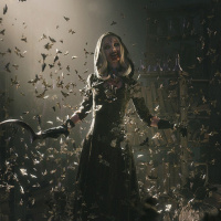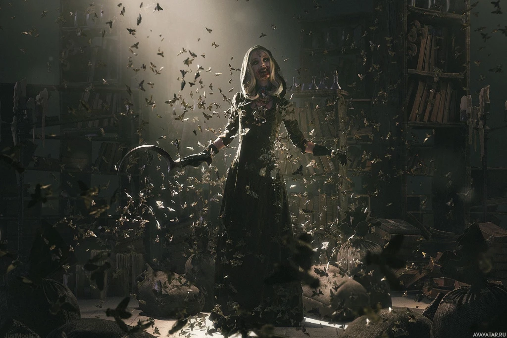 an intense expression on her face as she faces forward. There are numerous swarming insects surrounding her, which adds to the tense and chaotic atmosphere typically associated with the "Resident Evil" series. The lighting in the image is dramatic, with a mix of shadows and highlights that contribute to the suspenseful and action-packed