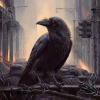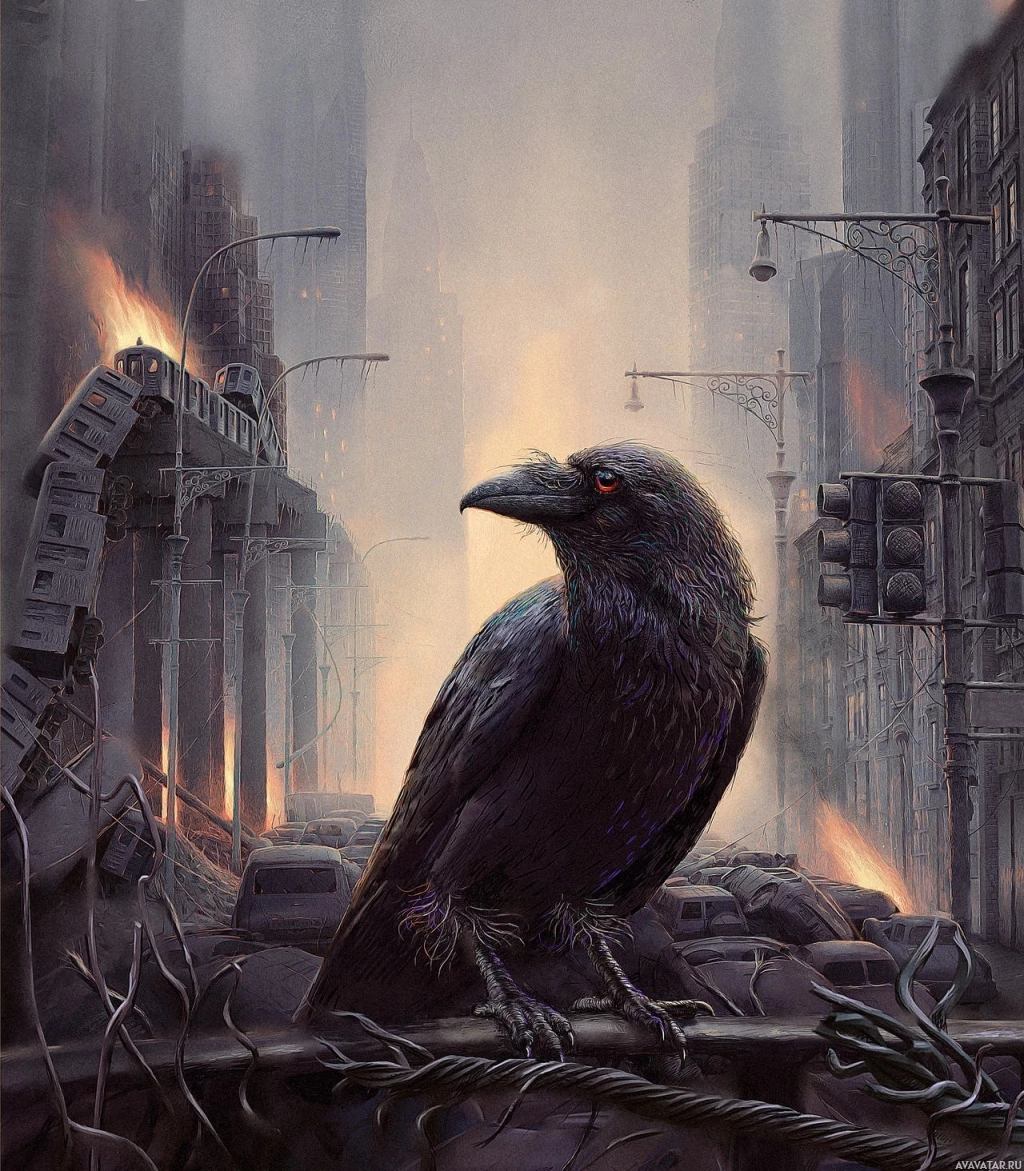 a large crow perched prominently in the foreground, facing towards the viewer with its wings spread out. In the background, there are ruins of buildings with twisted