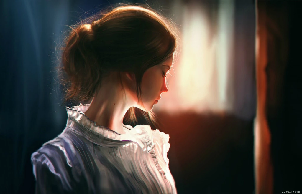 a contemplative expression, as if she is lost in thought or daydreaming. The art style appears to be realistic, possibly inspired by impressionism given