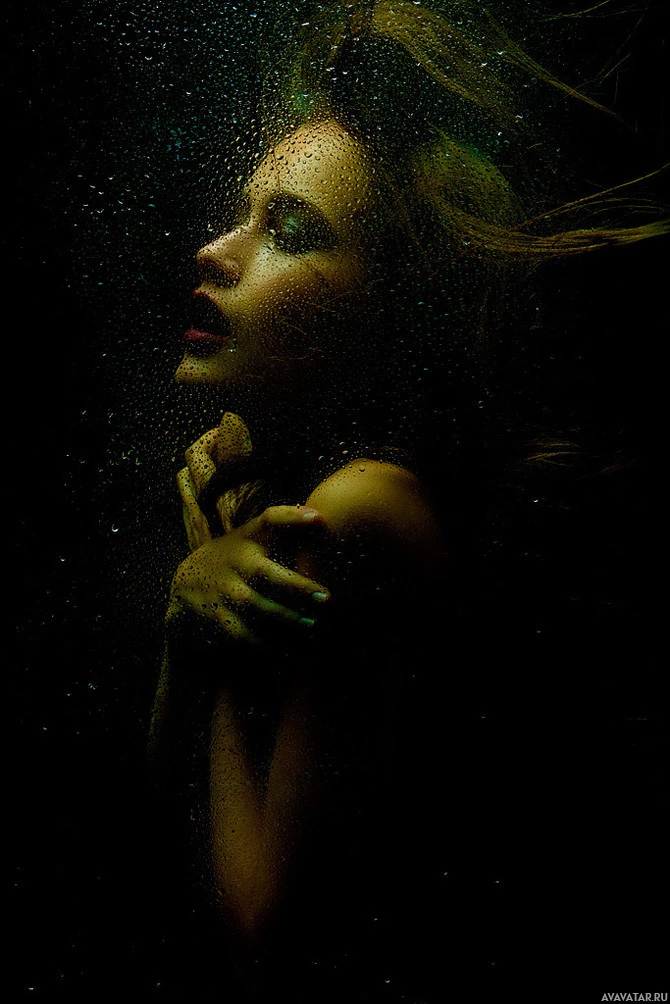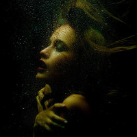 The image features a person submerged in what appears to be water or some form of liquid. The individual has closed eyes, and their lips are parted slightly as if they might be speaking or singing. The lighting is dim and ethereal, with