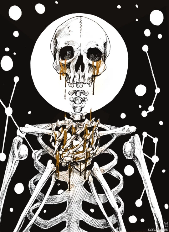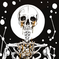 a celestial motif, with stars and what appears to be a constellation or astrological chart, suggesting a connection between the skeleton and astronomy or perhaps the cosmos. The artwork is detailed and has a contemplative or introspective tone, possibly relating to themes of life, death, knowledge, or spirituality.