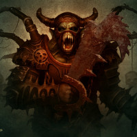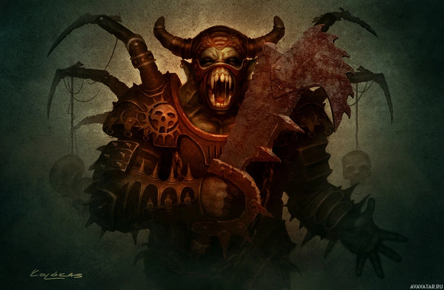 sharp teeth and horns, which are typical of the orc race in fantasy settings. The character is wearing armor that appears to be forged from bones or other