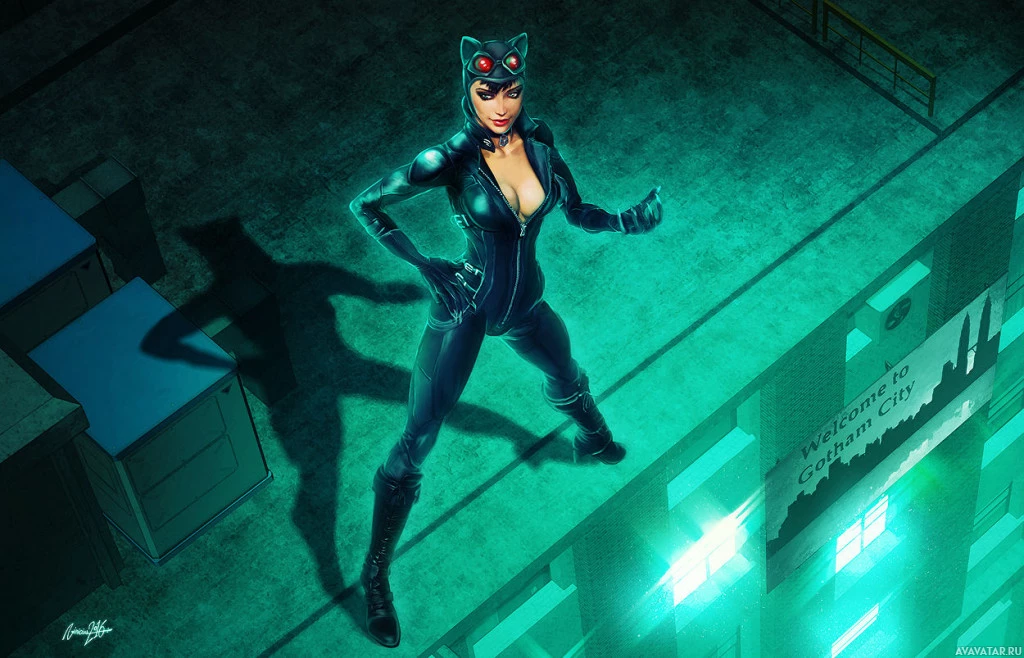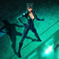 a Catwoman costume, standing confidently with her hands on her hips. She is wearing a black and gray outfit that includes cat-themed details, such as ears and a mask resembling