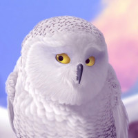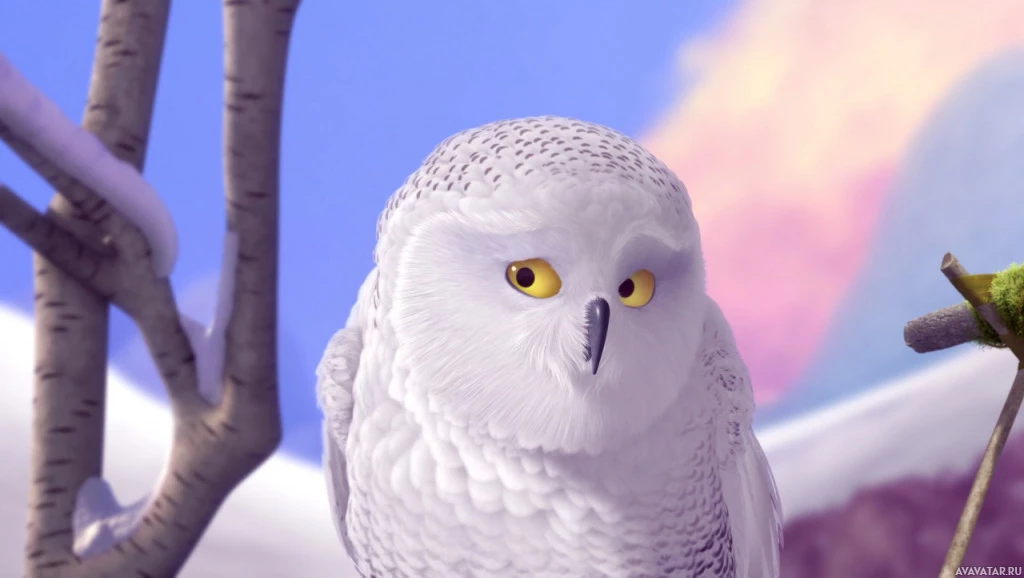 The image features a white owl sitting in front of what appears to be