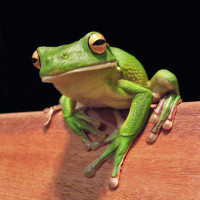 The picture shows a frog, which is an amphibian. The frog has distinct green and brown markings on its body, along with