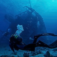 an old shipwreck. The diver is wearing scuba gear and appears to be looking at the wreckage, which includes rusted metal pieces scattered on