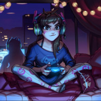 a video game or listening to music. The other character stands behind them, wearing a mask that resembles the D.Va character from the game Overwatch. D.Va is known for her cyborg armor and a suit of