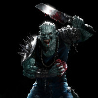 The image shows a monstrous creature wielding a chainsaw and standing over what appears to be a severed, bloody head. The creature is aggressive-looking with sharp teeth, bulging eyes, and claws, suggesting it's a horror or villainous character. This type of imagery is commonly associated with the horror genre in films and video games.