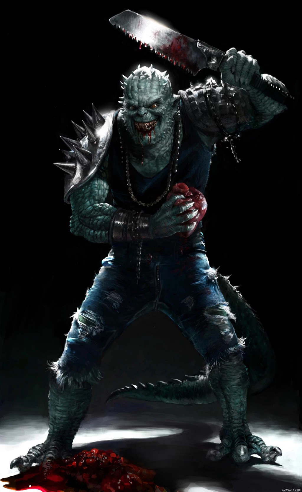 Картинка показывает чудовищное существо, владеющее бензопилой и стоящее над тем, что кажется отрубленной, кровавой головой. Существо агрессивно выглядит с острыми зубами, выпуклыми глазами и когтями, предполагая, что это ужасный или злодейский персонаж. Этот тип изображений обычно ассоциируется с жанром ужасов в фильмах и видеоиграх.
