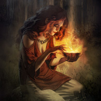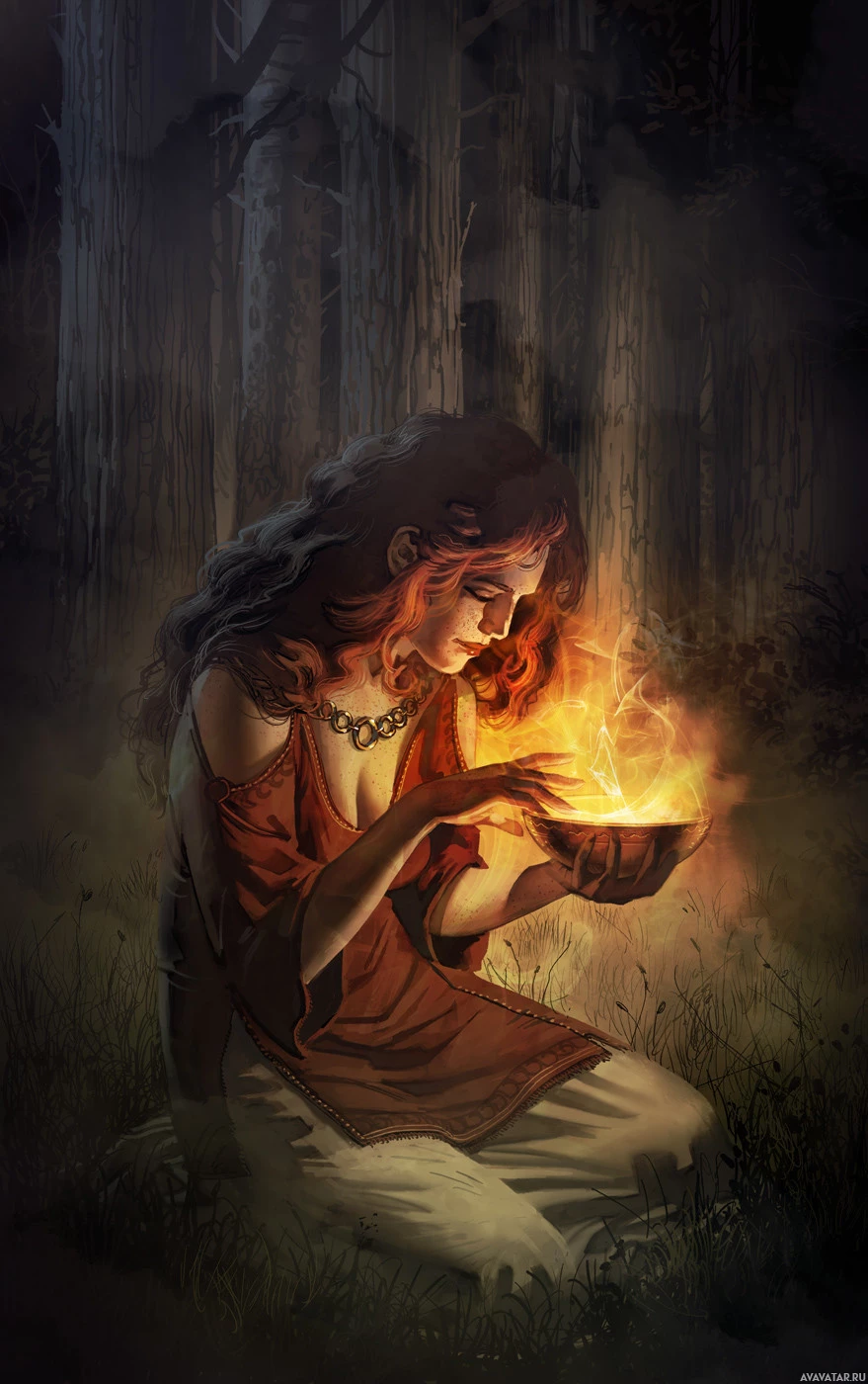 magical abilities, as she is holding a lit candle close to her face and seems to be performing some sort of ritual or spell. The atmosphere suggests