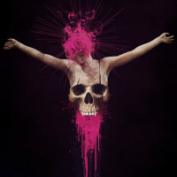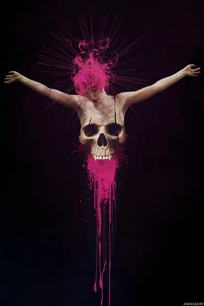 pink hair, reminiscent of a girl, on what appears to be a cross. The figure is positioned in a way that suggests crucifixion, but instead of a traditional body and head, there is an open skull that has been filled with