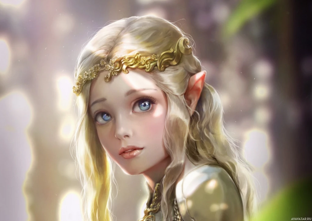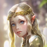 blonde hair, blue eyes, and pointed ears which are typical for fantasy elves. She is wearing a headdress with a jewel or gem at the center, and her expression appears to be contemplative or thoughtful. The background suggests a magical, forest-like setting with soft lighting that enhances