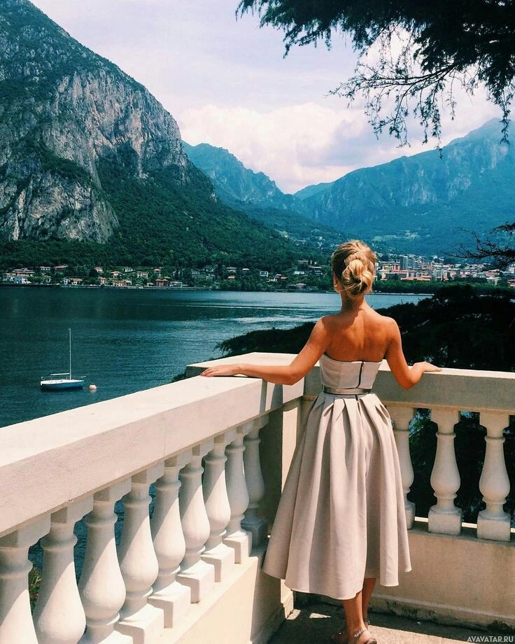 In the picture, there is a woman standing on what appears to be a balcony or terrace overlooking
