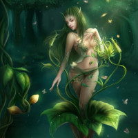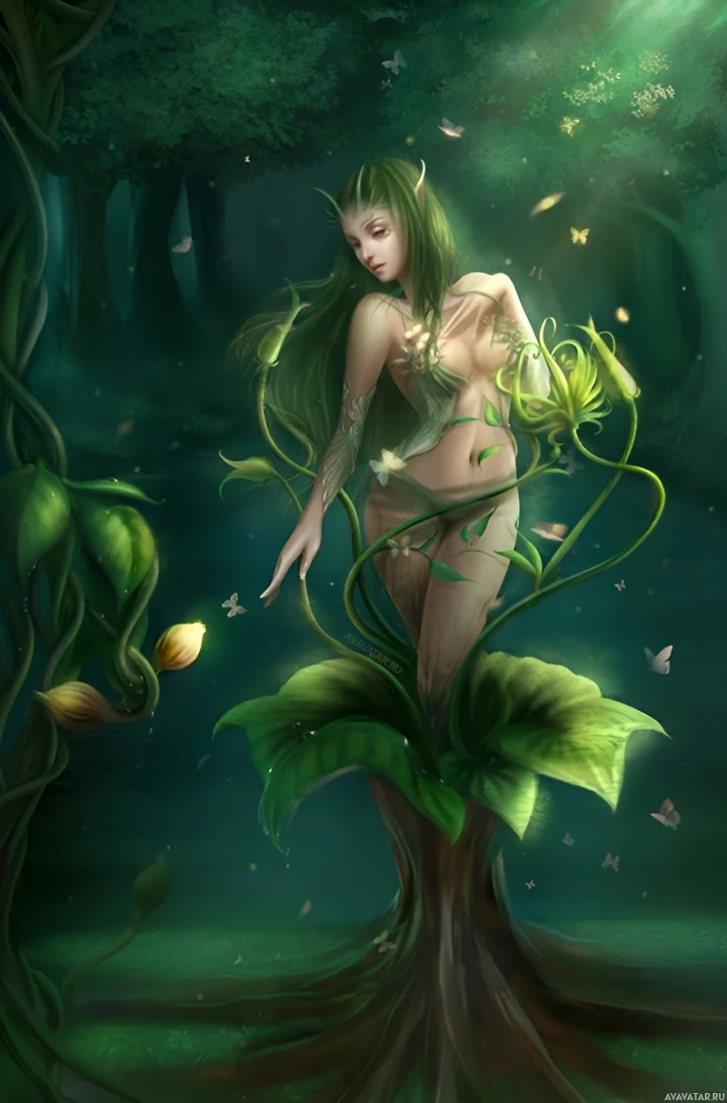 The image depicts a fantasy-themed scene with a character that appears to be a dryad. A dryad is