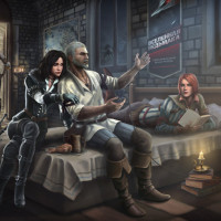 an interior room, possibly a tavern or inn, given the rustic decor and the presence of a sign or banner with the text "Rivia" visible behind the characters. This scene captures the essence of the game's world, which is based on