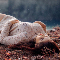 The image shows a woman lying on her back with her eyes closed. She appears to be relaxed and is surrounded by