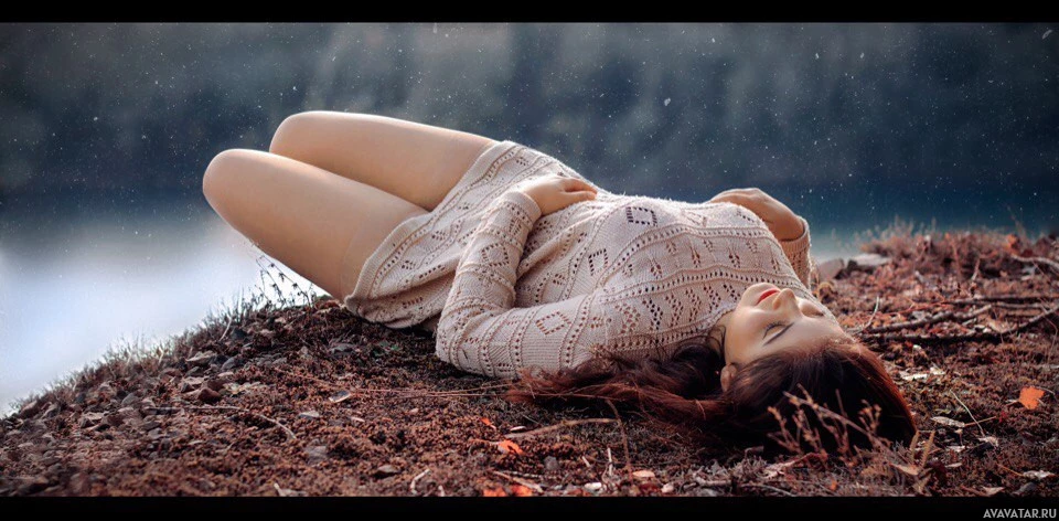 autumn leaves, which are orange in color, indicating that the photo might have been taken during the fall season. Her body is partially submerged up to her torso, suggesting she may be laying near a pond or riverbank where the ground has become damp from the water's edge. The overall atmosphere of the image is serene and contemplative.