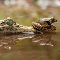 The image shows a large crocodile with an open mouth, seemingly swallowing its prey. It appears to be in a natural habitat, possibly a wetland or a body of water. There is no frog visible in this picture; the visible animal is a crocodile.