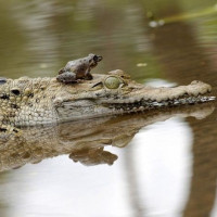 an unusual scene as crocodiles are predators known to eat frogs and other small animals for food. However, in this particular photo, it appears that the crocodile may have captured the amphibian, but instead of eating it, they seem to be sharing
