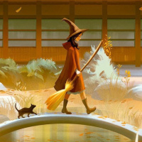 a long coat and carrying what looks like a broom. To the right of the witch, there is a cat walking on all fours, following close behind. The setting includes traditional Japanese architecture, with tiled roofs and