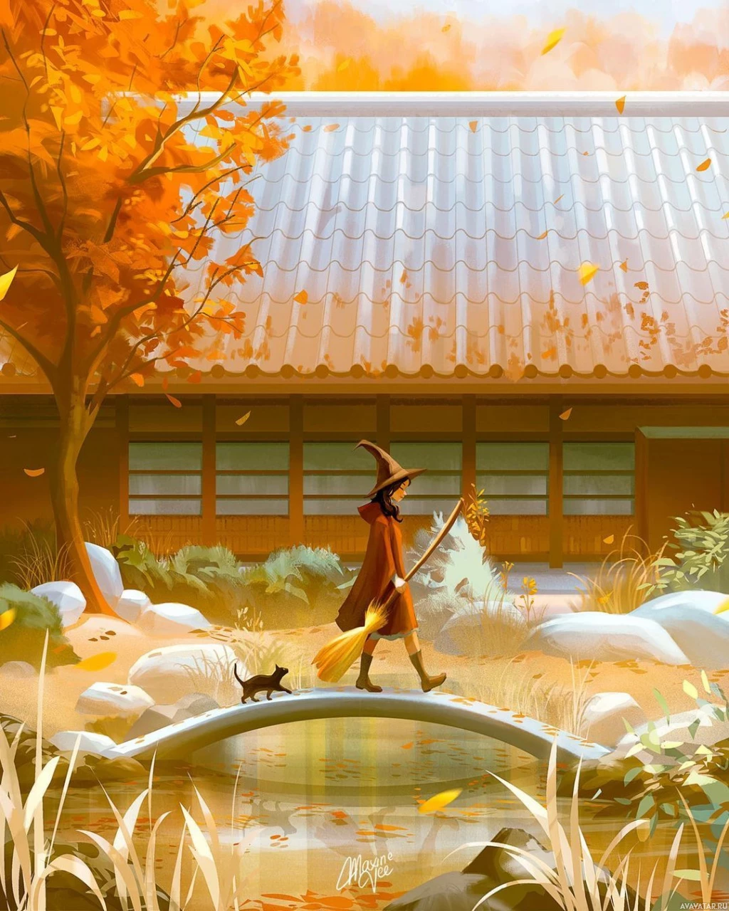 This is an illustration of a scene set during autumn. At the center, there is a character who appears to be a witch, dressed in