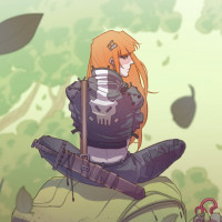 a natural environment, possibly a forest, given the presence of trees and leaves in the background. The art style is reminiscent of Japanese animation (anime).