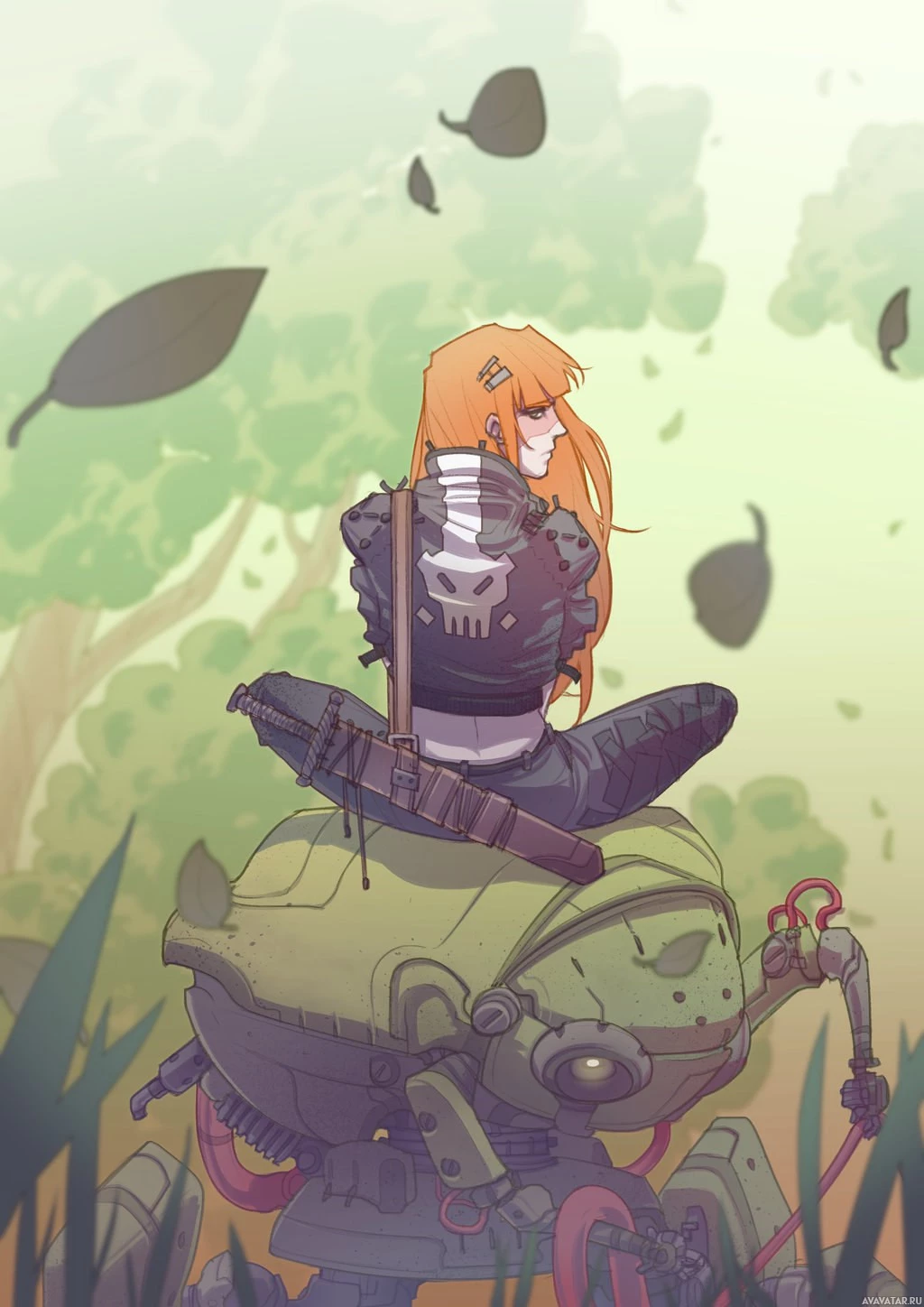 red hair, sitting on a mechanical contraption that resembles a tank or armored vehicle. The setting appears to be in