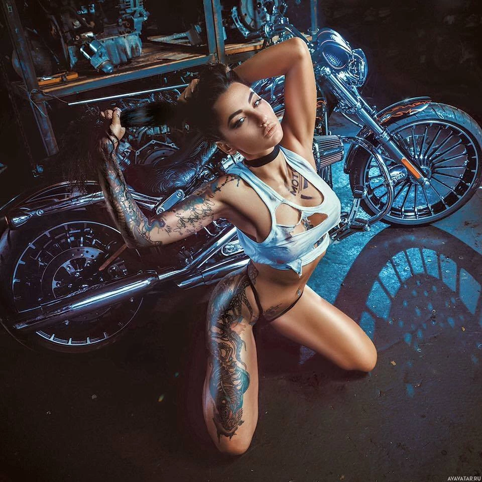 The image features a woman kneeling on the ground in front of a motorcycle. She appears to be posing for the photo, possibly showcasing a lifestyle or brand associated with motorcycles and adventure. The woman has tattoos and is wearing attire that suggests she might be involved in some form of motorsport or biker subculture. The motorcycle behind her is well-maintained and detailed, indicating it could be a high-