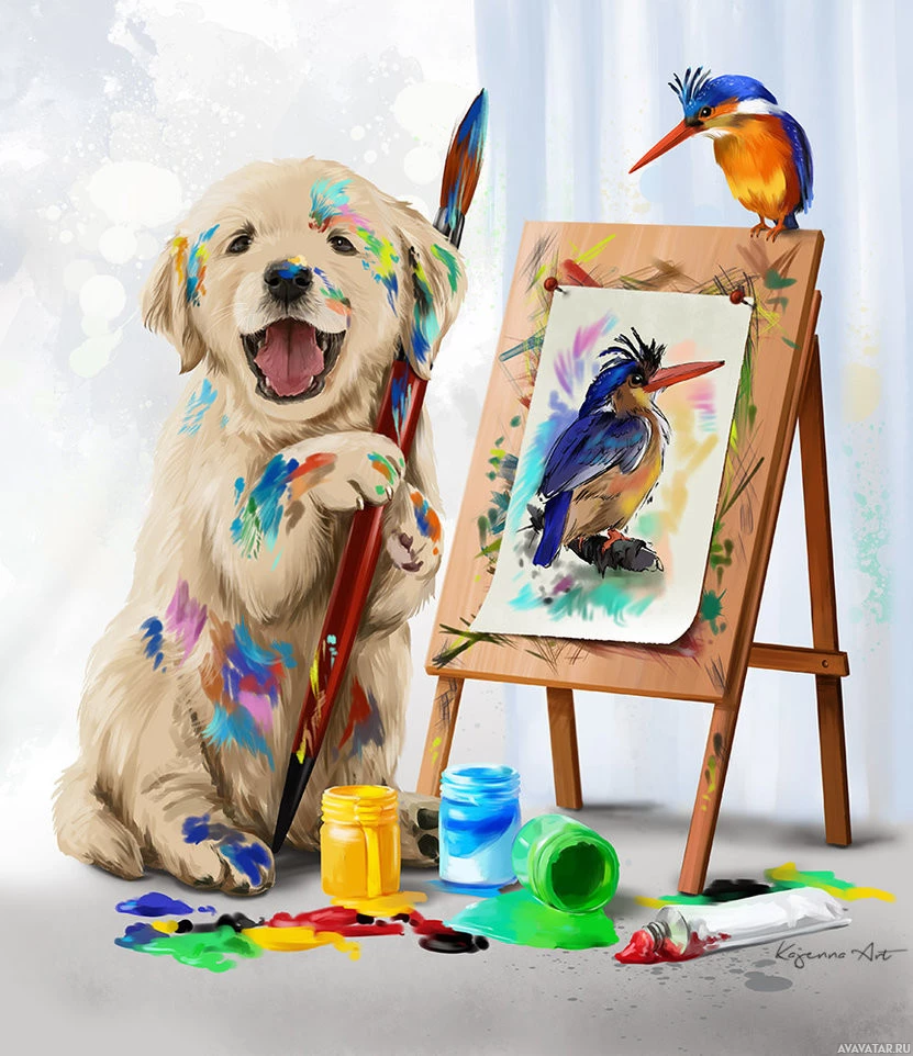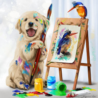 paint splatters on its fur, suggesting that it was involved in creating the artwork. A