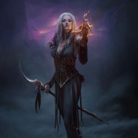 a role of a wizard, healer, or sorcerer. Her left hand grips
