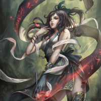 mythical role within a story or game setting. The background appears to be a forest-like environment with muted colors that give it a somewhat