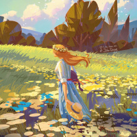 yellow flowers and appears to be looking at something ahead or to the side, rather than directly at the viewer. The sky above her is clear with some clouds scattered across it, suggesting an idyllic