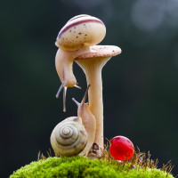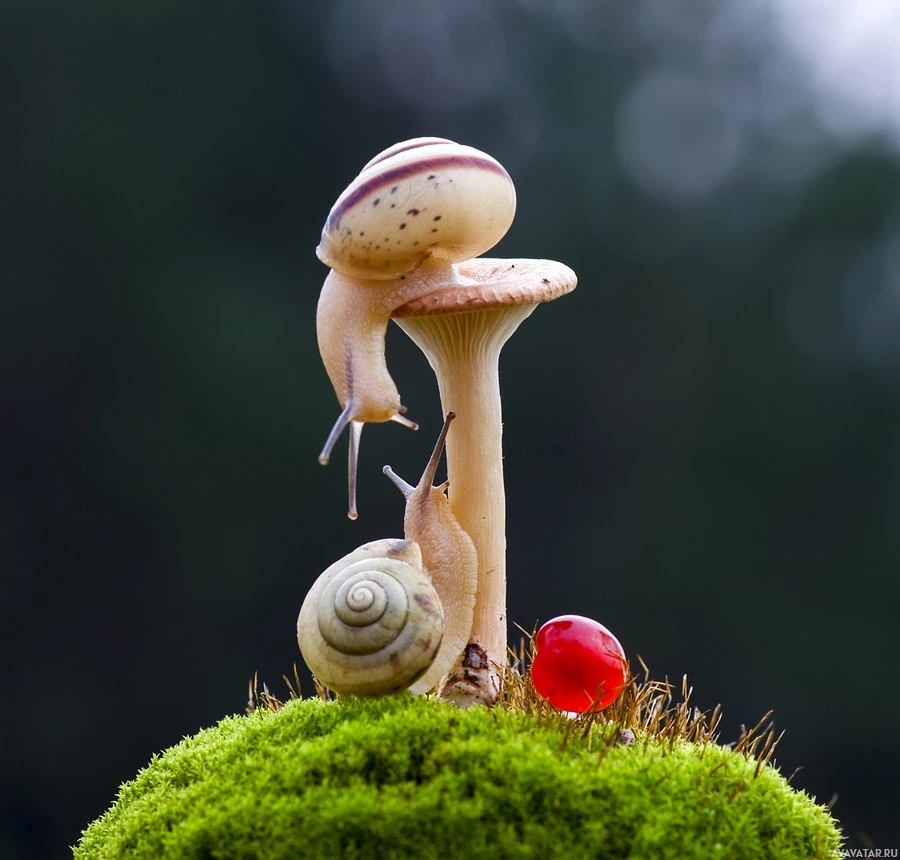 The image shows a snail sitting on top of a mushroom. Next to the mushroom, there is another snail that appears to be climbing onto or possibly off the mushroom. There is also a berry near the base of the mushroom, and some grass-like