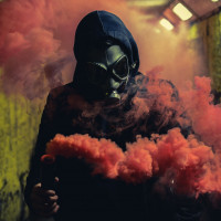 a red substance that could be smoke or another kind of powder, as it's being dispersed around them. The environment suggests an industrial or urban setting.