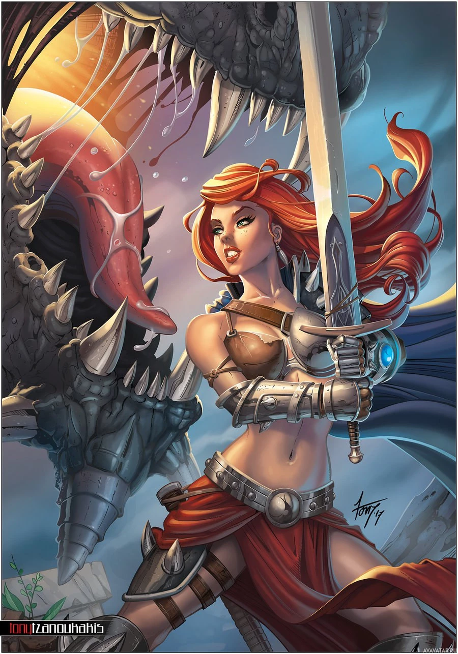 a fantasy setting, possibly engaging in battle or adventure. The girl is wearing armor and holding a sword, suggesting she may be a warrior or a knight of some sort. The background gives the impression of a mythical or otherworldly environment, which supports the fantasy theme of the illustration.