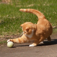 a tennis ball. The cat is on a surface that appears to be a driveway, and it seems to be playing with the ball or possibly trying to catch it. There are no other visible objects in the picture, so there's no need to describe them. The focus of the image is clearly on the cat and its interaction with the tennis ball.