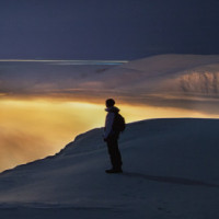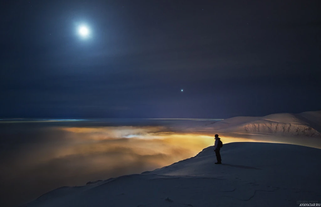 a silhouette of a person standing on the edge of a cliff. The individual appears to be looking out over a landscape that includes fog and snow-covered terrain, with