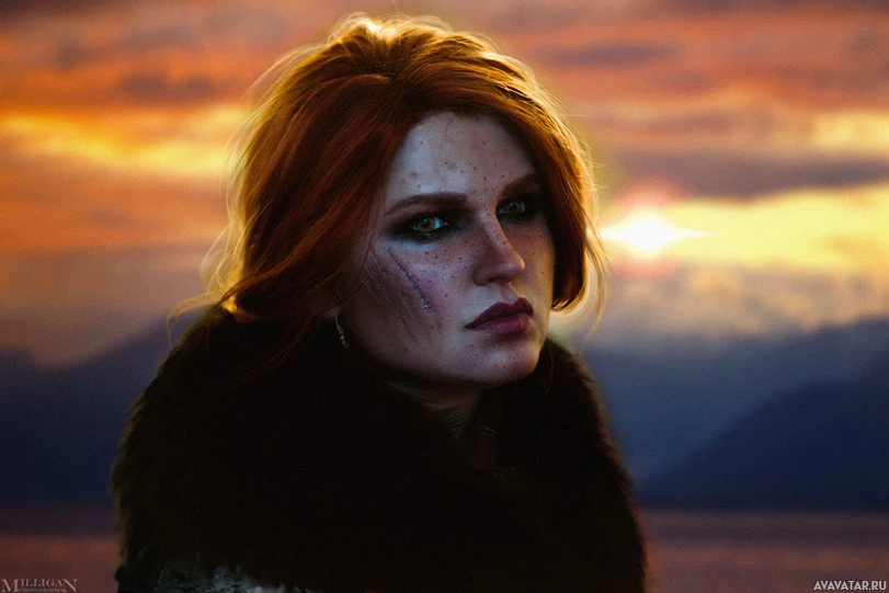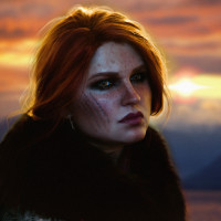 fantasy clothing, including a fur garment around her shoulders and a hood covering part of her head. The background features an artistic rendition of a sunset over mountains, suggesting a setting that could be related to the game "The Witcher 3: