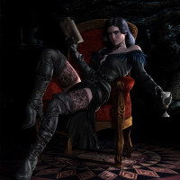 a glass of wine, which could imply a relaxed or celebratory moment within the context of the game. The setting has a dimly lit, possibly underground or ancient look, with stone walls and arches that contribute to