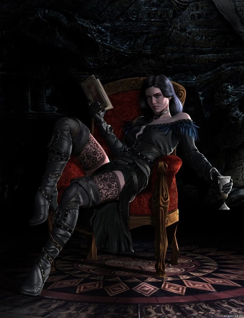 dark hair, pointed ears typical of an elf in fantasy settings, and she is wearing black clothing that resembles armor with boots. The character is seated on a throne, holding what appears to be a book open in her hands, suggesting she might be reading or using it for some magical purpose. She is also holding