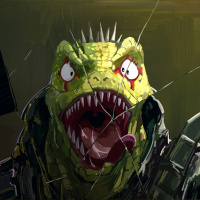 green skin and a humanoid body with some reptilian traits like spiky teeth and a scaly texture. The character is also wearing armor, suggesting that it may be involved in combat or adventure within the game's