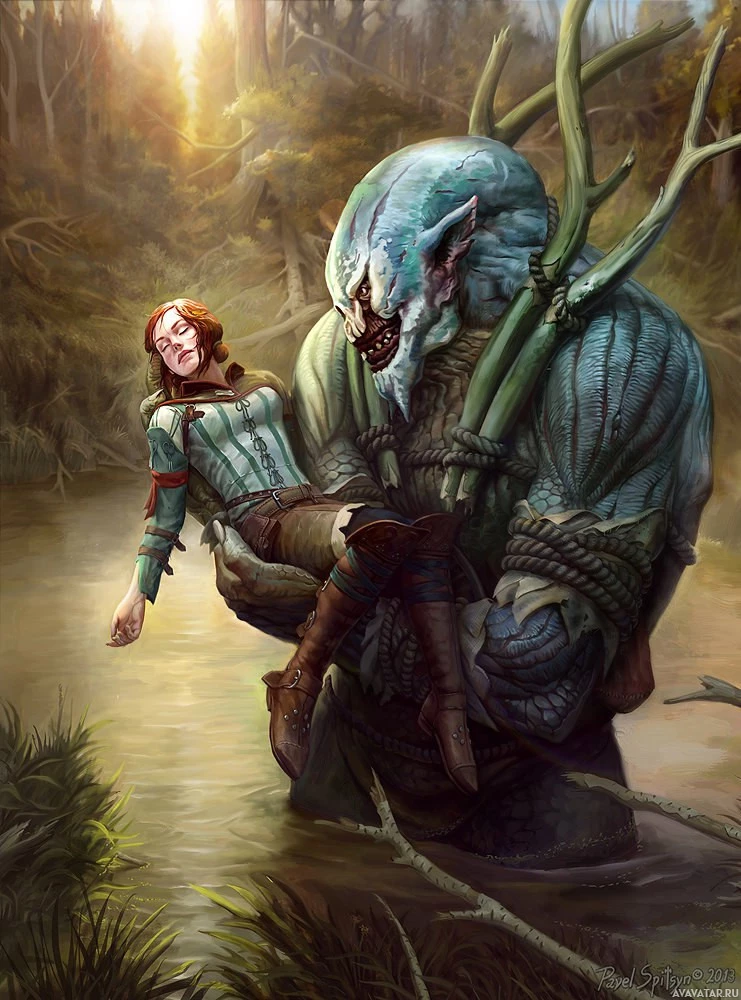 a large creature that looks like a gnome, also known as a dwarf, wearing a set of armor with bone decorations and carrying what seems to be a weapon in its left hand. The setting is a forested area with misty conditions, suggesting either dawn or dusk due to