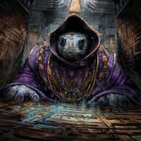 hooded cloak and is sitting at a table or altar that has a grid of symbols on it, suggesting some sort of magical activity or preparation for casting spells. The setting seems mystical or otherworldly, possibly indicating a scene from